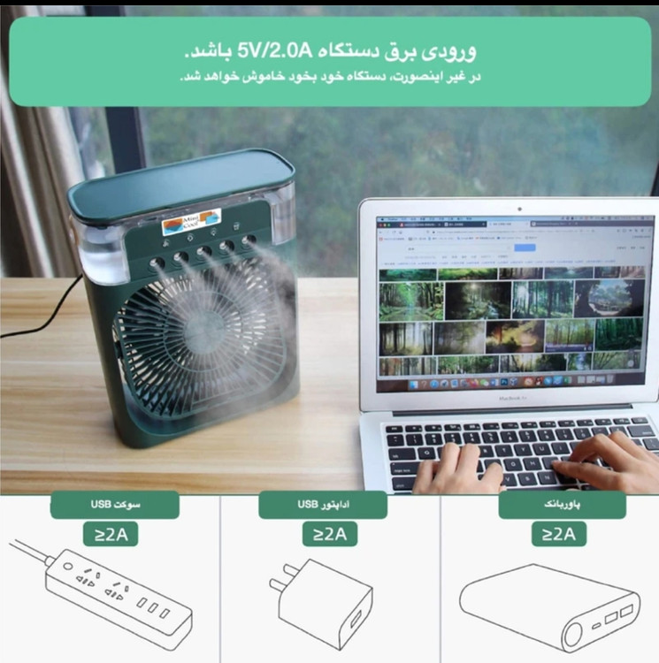 | سایر مشخصات | امکانات دستگاه شامل مه پاش با 5 نازل فعال، فن قوی سه سرعته با چرخش 1800rpm، چراغ ال ای دی 7 رنگ و تایمر 1، 2 و 3 ساعته می باشد. دستگاه جمع شونده بوده و حمل آن بسیار ساده است. مصرف برق بسیار بهینه و قابل اتصال به تمام درگاه های USB با خروجی 5V2.0A می باشد. صدای دستگاه در حد 30 دسی بل بوده، ورودی 2 آمپر و توان گردش پره 1800rpm، ابعاد کلی 21x10x28 میلی متر و ابعاد فن، حدود 15x15 میلی متر می باشد. |
